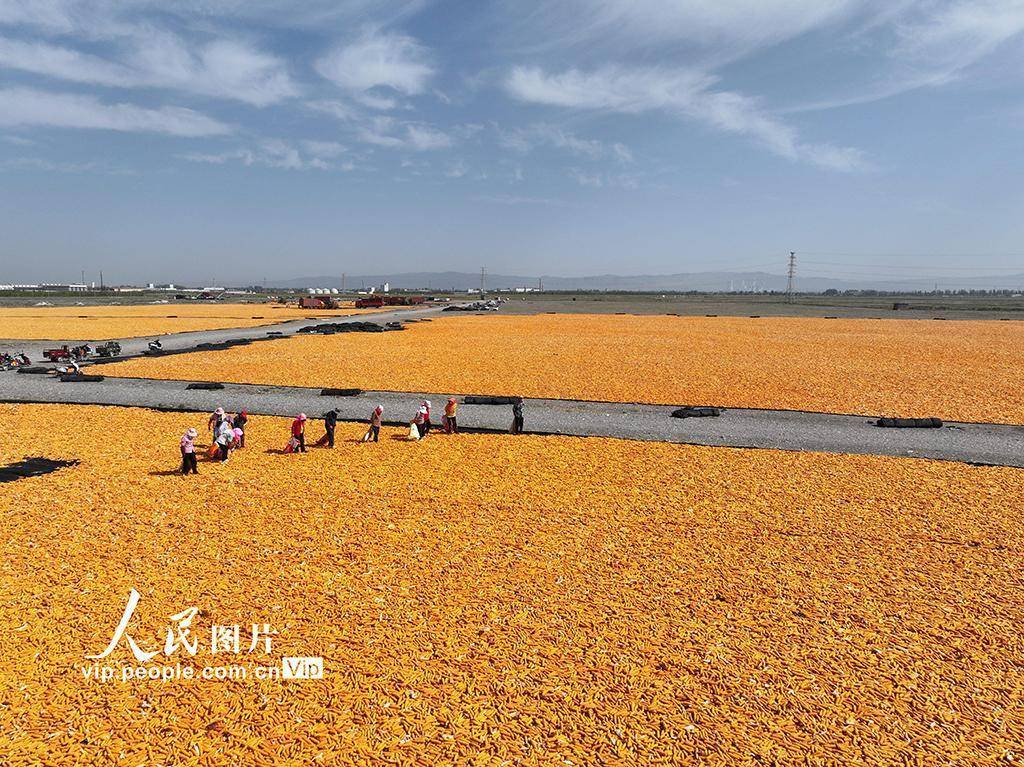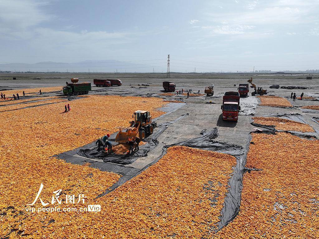 2025年9月7日,甘肃省张掖市甘州区一玉米制种公司晾晒场上,工人们正在装车转运晒干的玉米种子。吴学珍摄(人民图片网)
